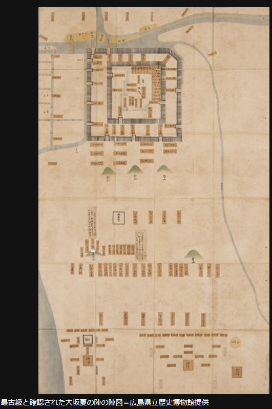 徳川家康が豊臣家を滅ぼした大坂冬の陣(1614年)、夏の陣(15年)の詳細な陣形を記録した最古級、最大級の陣図が見つかった、と広島県立歴史博物館(福山市)が4日、発表した。大阪歴史博物館(大阪市中央区)は「主戦場だった城外の部隊配置まで詳しく示された陣図は過去に例がなく、戦いの様子を知る重要な史料といえる」としている。